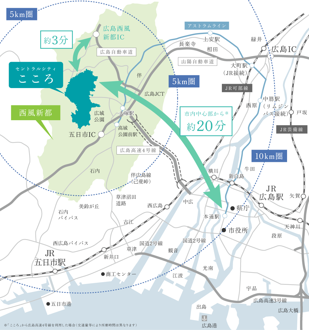 高速4号線の利用で広島市内中心部まで20分でアクセスが可能なため、気軽に市街地へ行くことができます。 また、バス停も団地徒歩圏内に点在しており移動手段に困りません。広島西風新都ICからも近いため、ご両親が遠方の場合でも招きやすく、他県に遊びに行くことも容易で遊びの幅が広がります。