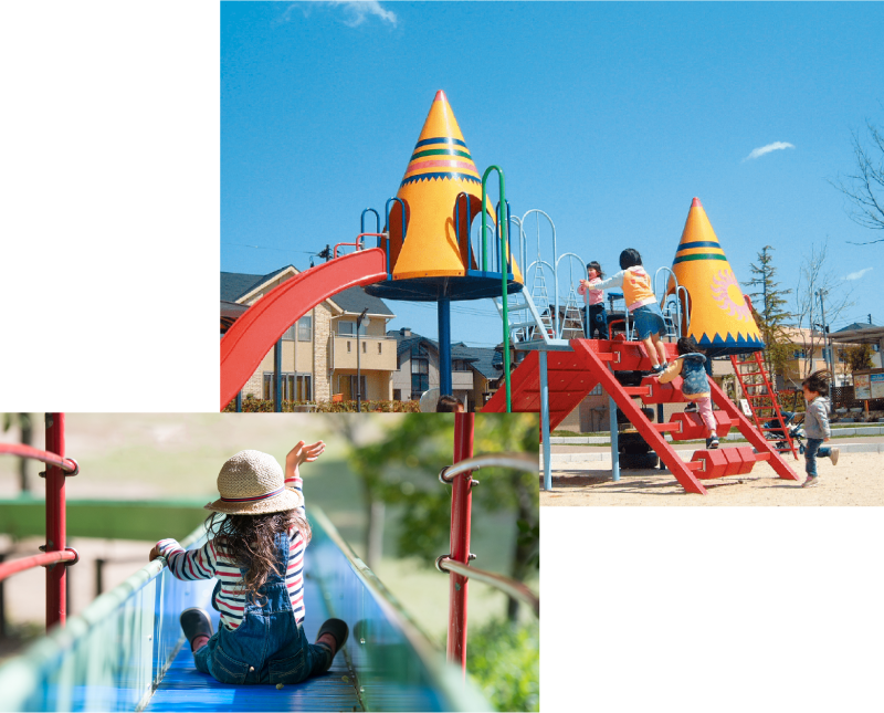 こころには、日々の暮らしで大きな負担となる急な坂道がほとんどありません。生活エリアの道路幅はゆったりの6mで、自転車やベビーカーなどの移動もしやすい道幅。また、団地内の各所には遊具が整った広い公園がたくさん。家の近くで思い切り遊べるからパパママも安心。ママ友など、人とのつながりも生まれやすい環境です。