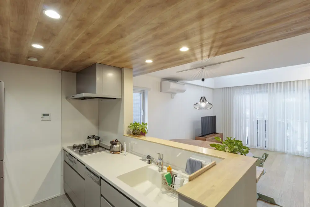 LDKを一続きにした広い空間では、例えばキッチンの天井部分を少し下げて木目の板材やクロスで仕上げるとゆるくゾーニングできて、空間にリズムが生まれますよ。またLDKの長手方向に下がり天井を設けて木目のクロスを貼ると、空間にメリハリと奥行きを感じさせる効果もあります。ホワイトやアイボリー、ベージュなどのカラーイメージでナチュラルテイストにすると木の素材感を活かしつつ、気持ちも軽やかに落ち着いて過ごせる空間になります。