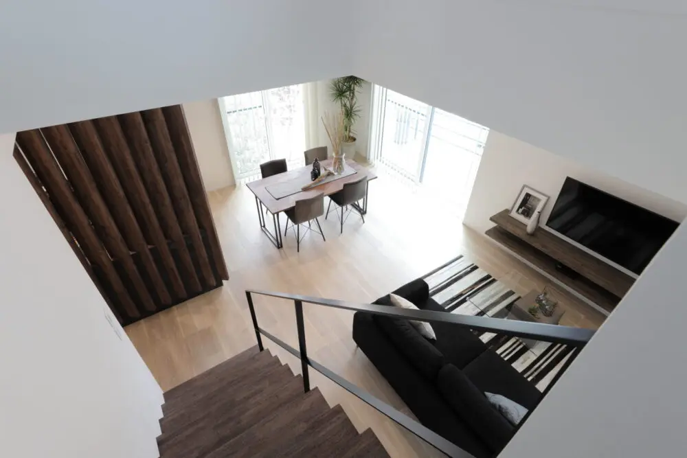 踏込板のない階段で、スケルトン階段やストリップ階段とも呼ばれています。階段の奥に視線が抜けるため圧迫感がなく光を遮らないので、明るく開放的な空間を演出できます。