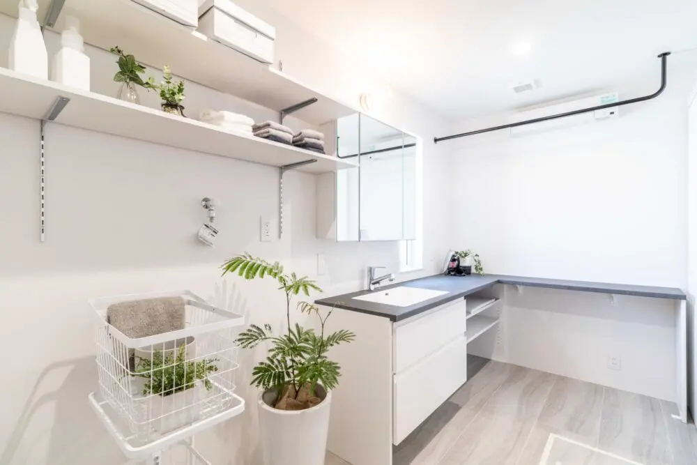 もう少し広いスペースを割けるようなら、アイロンがけや仕分けができる作業台を設けることもできます。作業台の下を収納にすれば、タオルや下着、パジャマなど、浴室周りで利用するものはそのまましまえるので便利です。アイロンがけなど、作業に必要なスペースを考えて、作業台の大きさを検討しましょう。