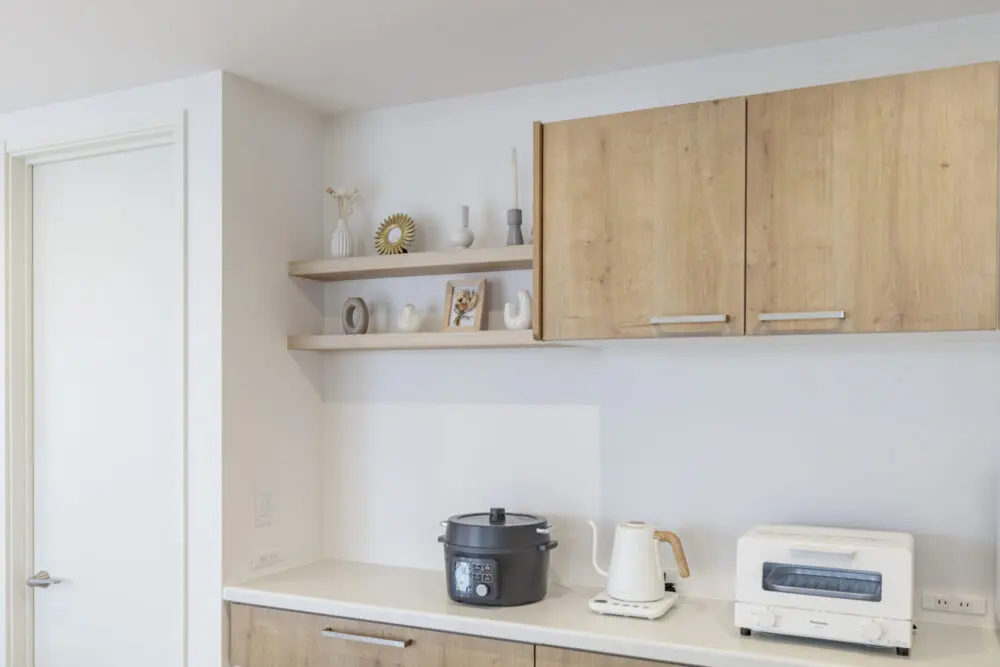 また、フードプロセッサーなどの一時利用家電のために、キッチンカウンターの間にもコンセントを配置しておくと、レシピチェックや音楽再生のためのデバイスを充電できるので便利です。