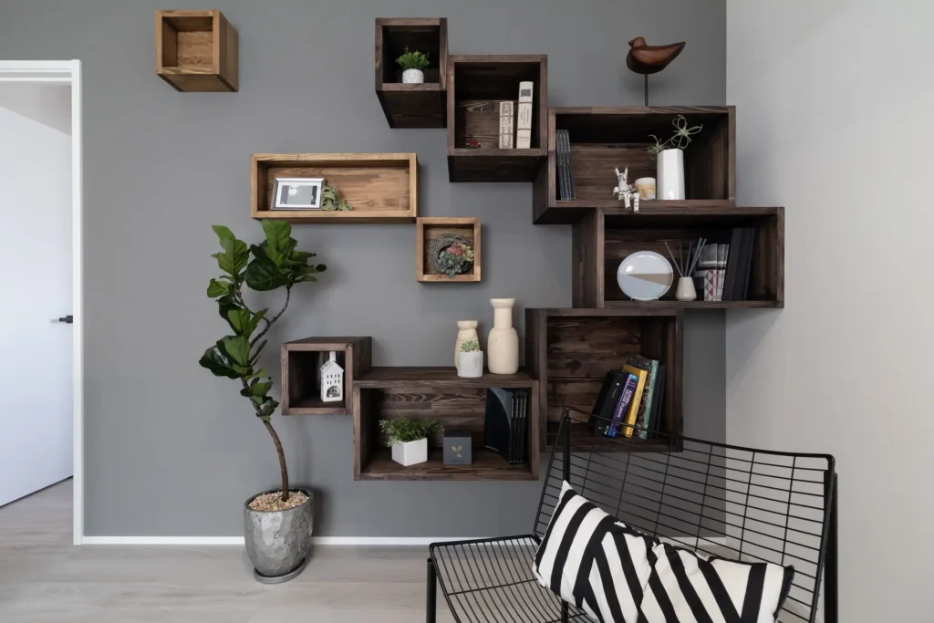 収納に便利な棚は、側板タイプやレールタイプの棚だとどうしても見た目がすっきりとはしづらいことがあります。そこでおすすめしたいのは、金具が全く見えない隠し棚受け。リビングなどに付ければ、まるで棚が浮いているようにも見えて小物やインテリアが映える魅せ方ができます。