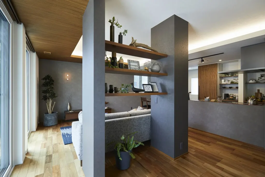 収納というとあらかじめ専用のスペースを設けるイメージが強いですが、壁のない空間に棚を置いて収納をしながら空間を切り分ける方法もあります。背面を抜いた飾り棚なら視界の抜けが適度な目隠しになるので、圧迫感も少なく空間をゆるく仕切ることができますよ。