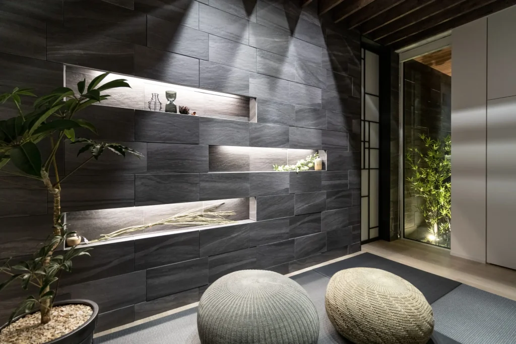 間接照明や印象的なタイルなどで仕上げることでデザイン性も高まりますし、ニッチの中にインターフォンやスイッチなどをまとめる「スイッチニッチ」にすれば部屋全体がすっきりとした印象になります。