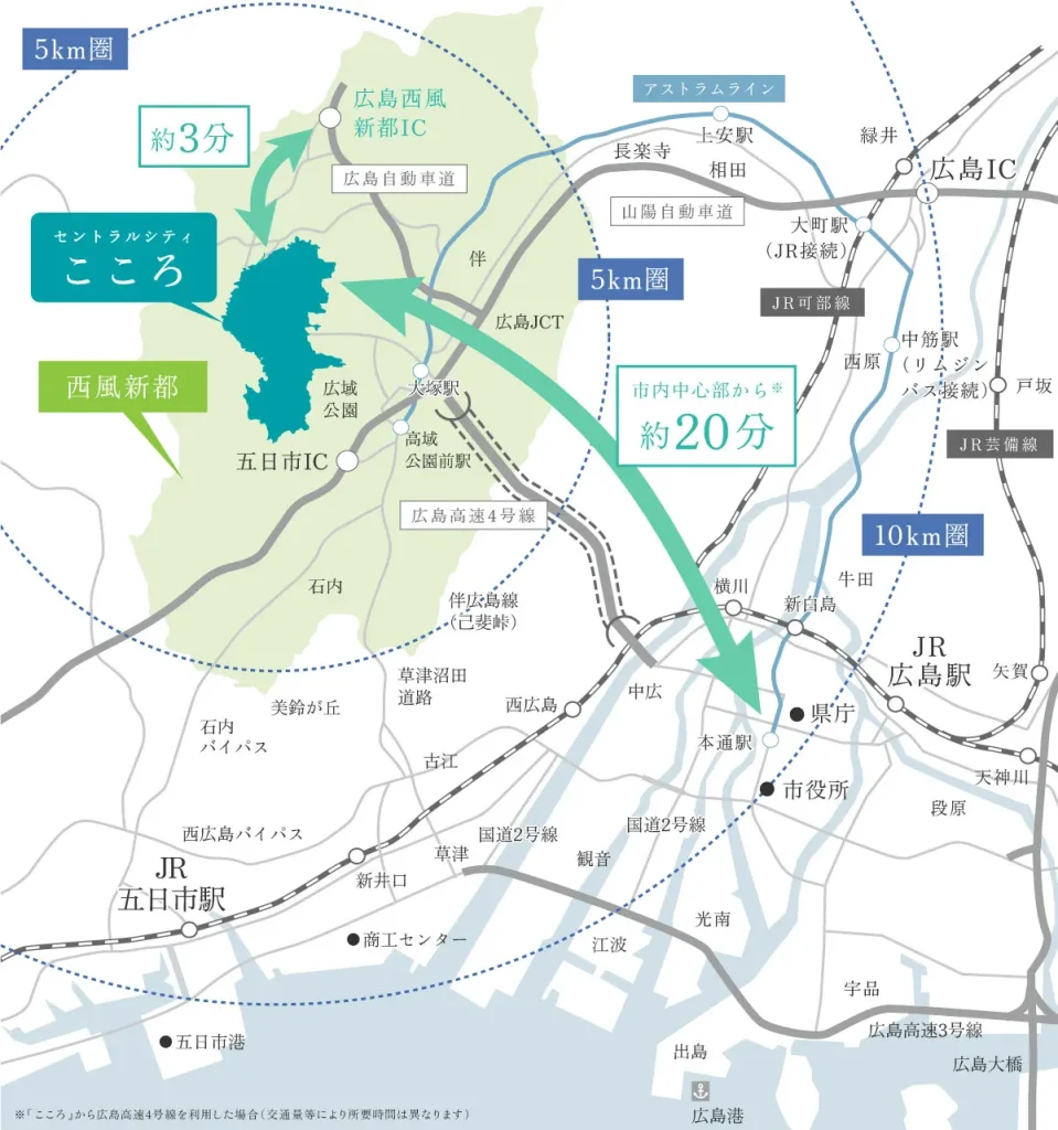 高速4号線を利用した場合、広島市中心部まで車やバスでのアクセスがとっても便利。