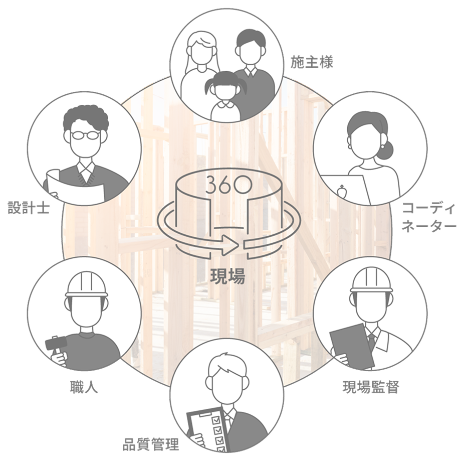 さらに、現場に行けない設計士や営業、インテリアコーディネーターもリアルタイムで現場状況を共有できるため、ご質問やご相談に迅速に対応。手戻りのないスムーズな家づくりを実現します。