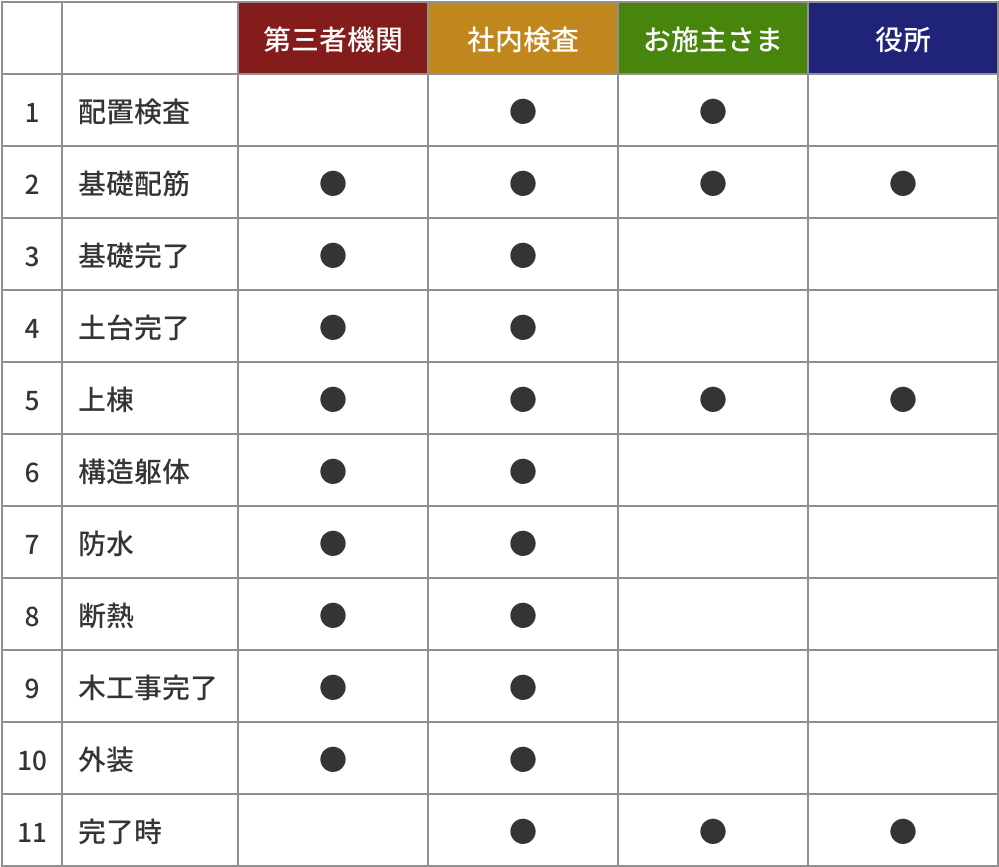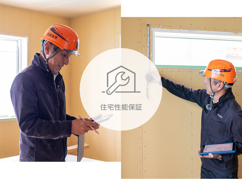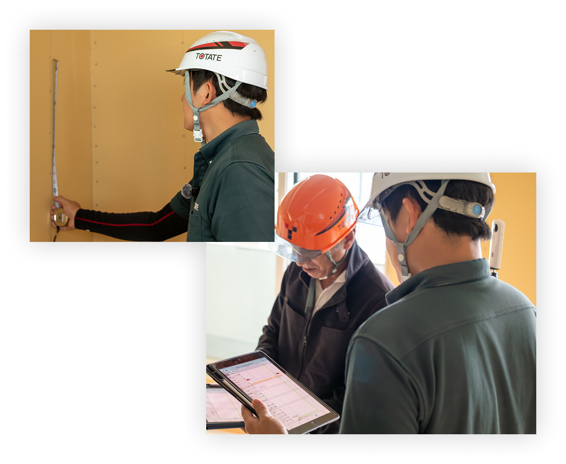 トータテハウジングでは、社内の厳しい施工基準に基づき、第三者機関による品質監査システムと、社内専門部署による検査を着工から完成までの各段階で監査を行っています。
