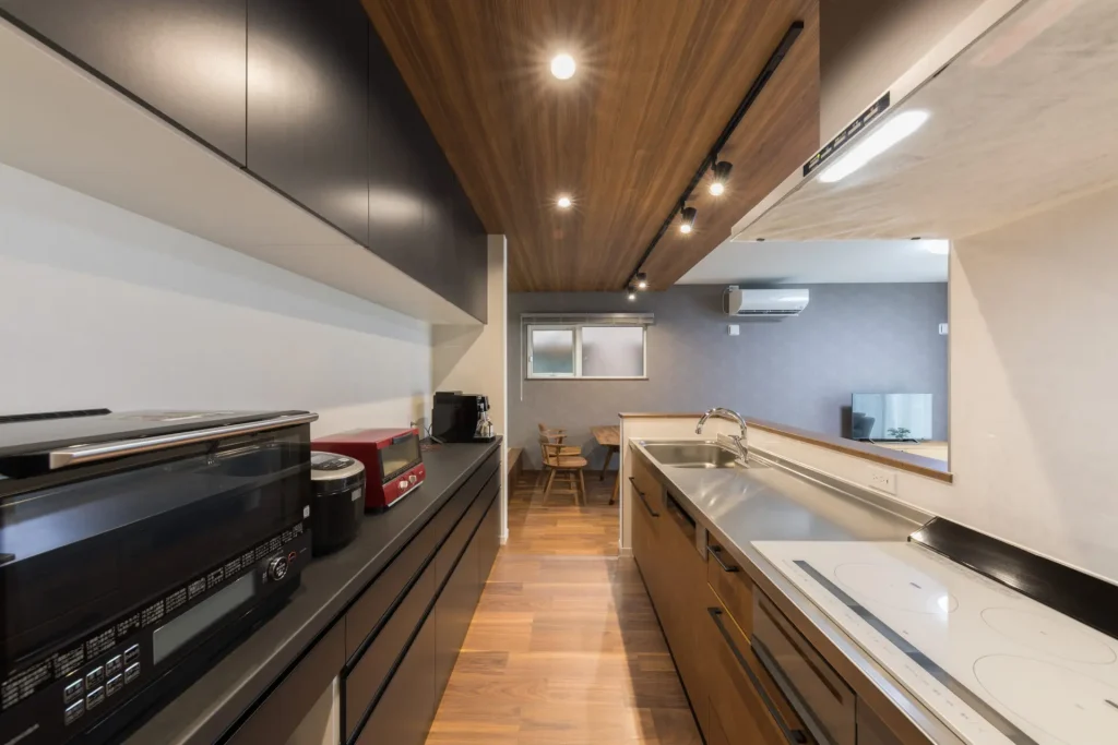 シックな色調の木目とモノトーンを組み合わせたコーディネート、キッチンからダイニングへ続くストレートラインなど、モデルハウス「NOKIYA」のイメージを取り入れた。