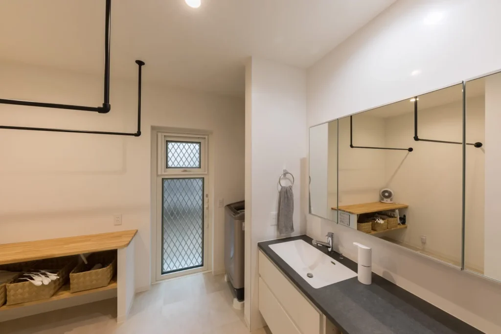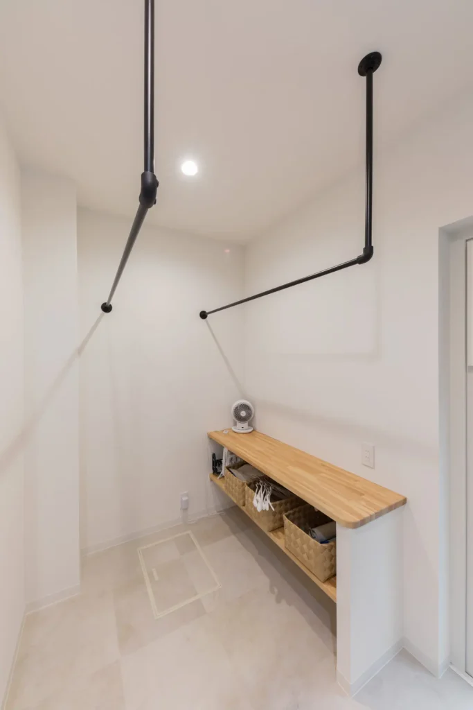 洗面室をL字型に広く設けてランドリールームの機能をプラス。プライベート空間にしたことで、出し入れ不要の常設タイプの物干し用のポールを設置して、より便利に。