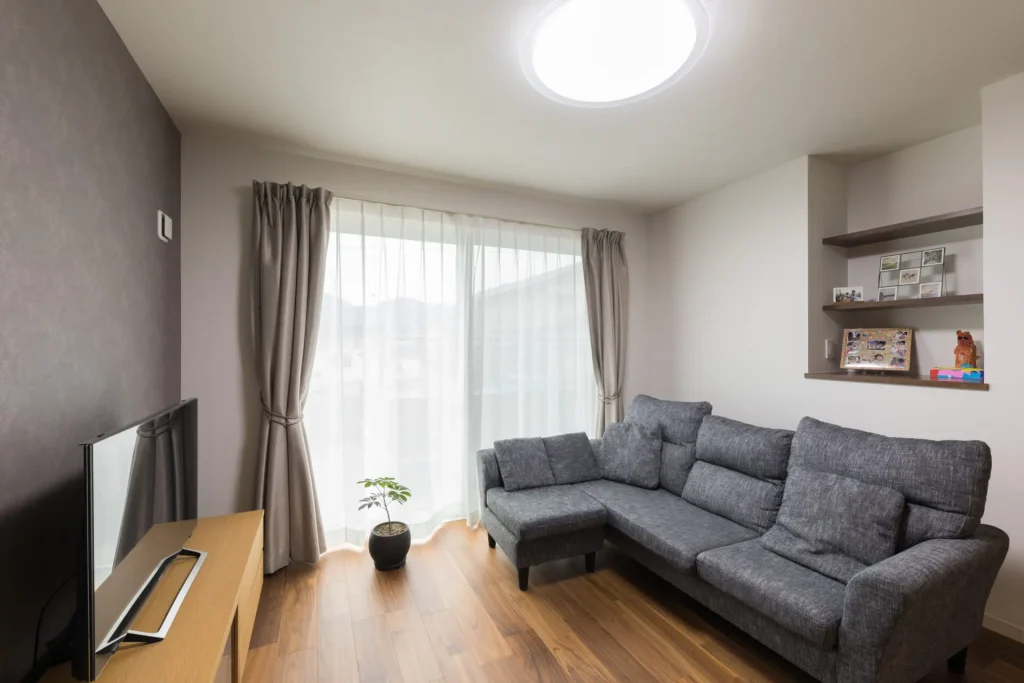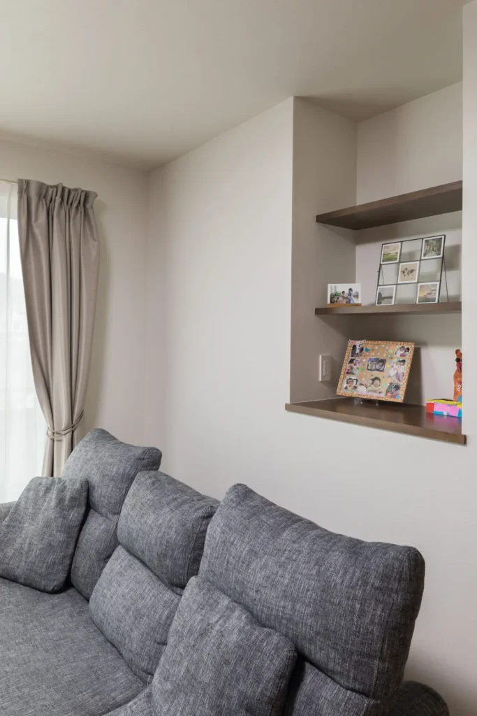 リビング側の壁は、ニッチの飾り棚に活用。お子様の絵本や図鑑、思い出の写真を飾ったりと楽しみ方はいろいろ。
