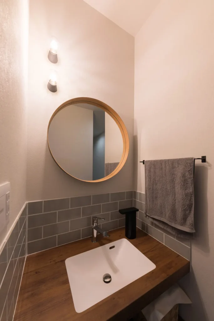 取り入れたかった機能の一つが、玄関とリビングの間に設けた手洗い洗面。デザインにもこだわり、帰宅後はもちろん、ゲスト用としても活躍。