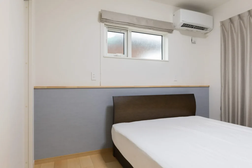 主寝室の壁の工夫は新谷さんの提案。ベッドのヘッドボードの上に小物が置けるように、壁をふかしてカウンターを設け、アクセントクロスを貼った。
