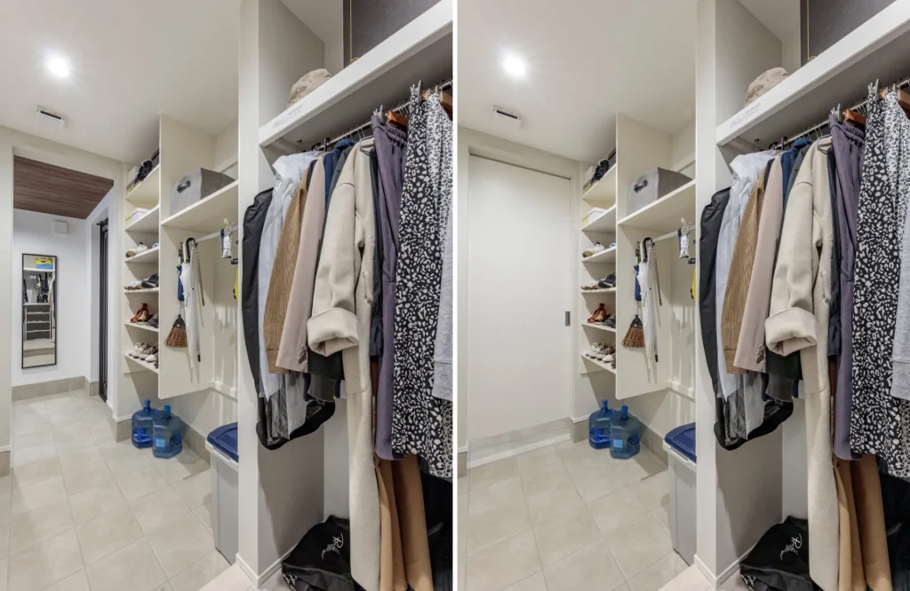 シューズインクロークの手前はファミリークローゼット。外出前、帰宅後の動線をスムーズにする上、ランドリールームにも近く、洗濯した衣類の収納にも効率的な家事動線になっています。