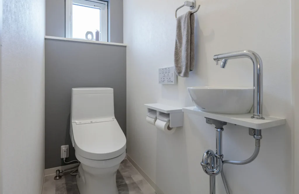 床とアクセントクロスにグレー系を採用し、落ち着いた雰囲気にまとめた2階のトイレ。