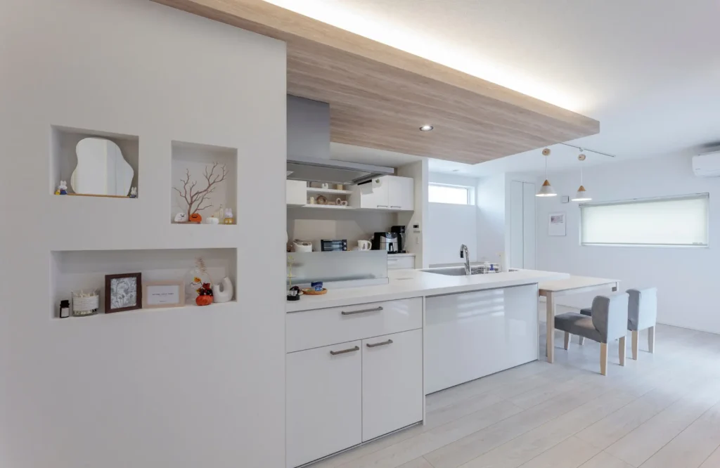 床とキッチンの下がり天井、カウンター、ダイニングテーブルの淡い木目が、白をベースにしたインテリアになじむ、柔らかな印象のコーディネートに。