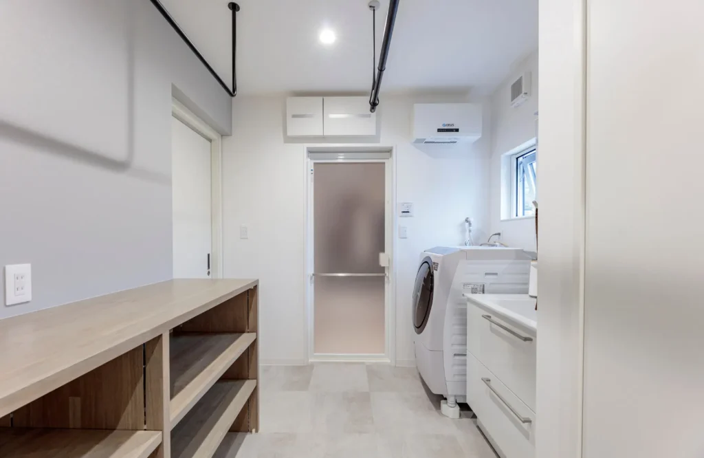 洗濯物をたたむことができるカウンターを設置し、上部にはポールを設置。センターには、来客時には取り外し可能な室内干し器具を設置しました。