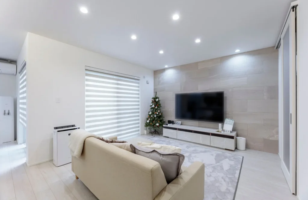 すっきりと壁付けにしたテレビの背面にはベージュの石目調のエコカラットを選択。