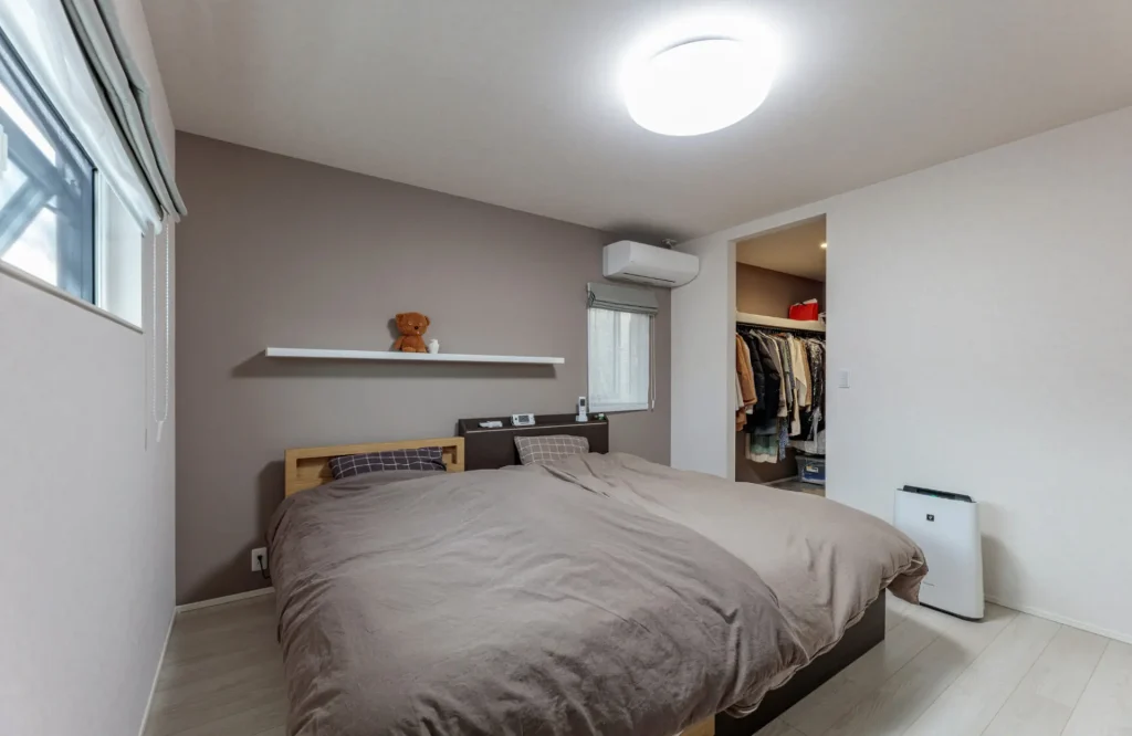 主寝室は、ベッドのヘッドボード側の壁に落ち着いたグレーのアクセントクロスを採用し、カウンターを設置。