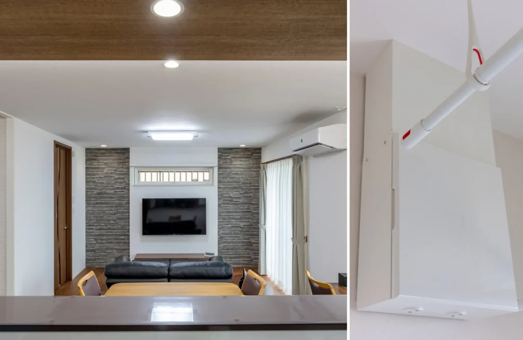 パネルはフィルター交換のメンテナンスしやすさを考えて、小屋裏ではなく手が届く室内(1階はランドリールーム、2階は書斎)に設置しました。
