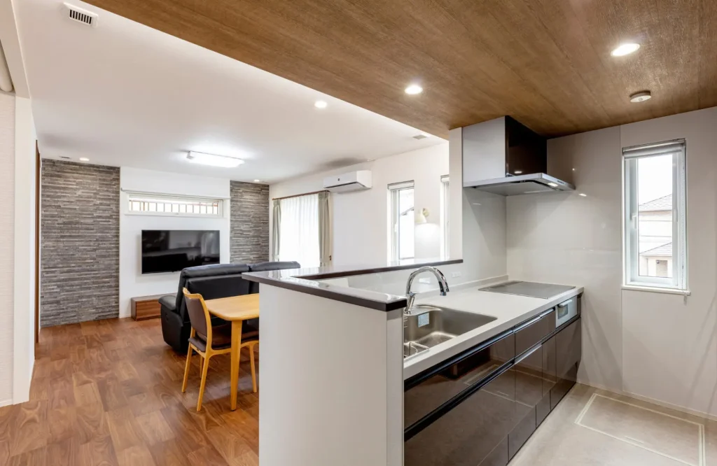 リビング、ダイニング、キッチンをIラインにレイアウトしたLDK。