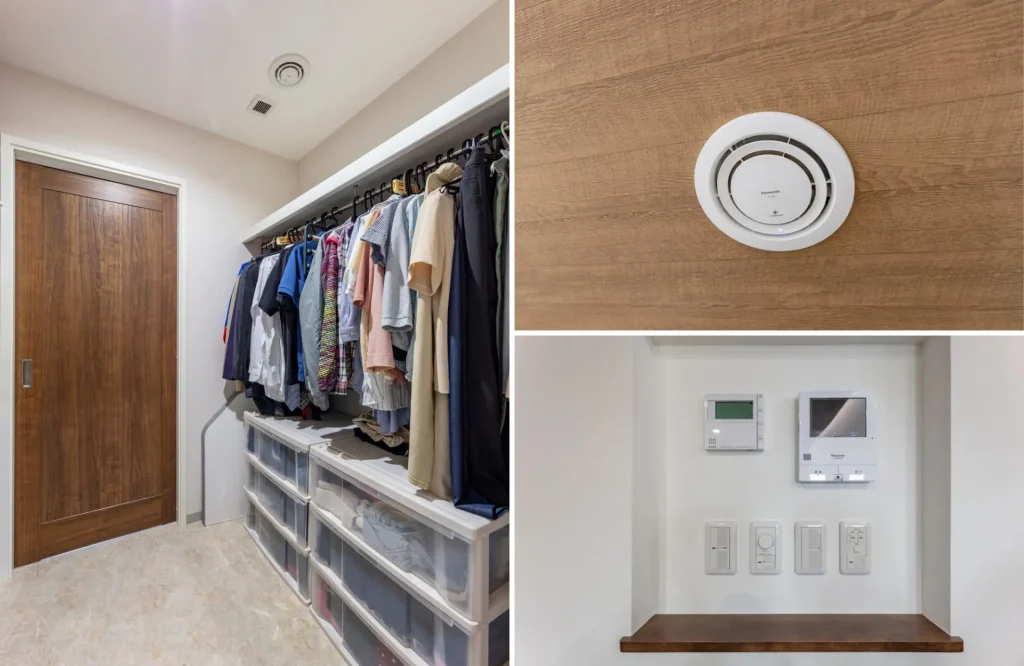 室内の環境にこだわり、イオンの力で空気中の菌やウイルス、アレルギン物質、匂いなどを抑制するナノイーを発生する装置「エアイー」を、クローゼット、シューズインクローク、キッチンのダストボックススペースの上に設置。
