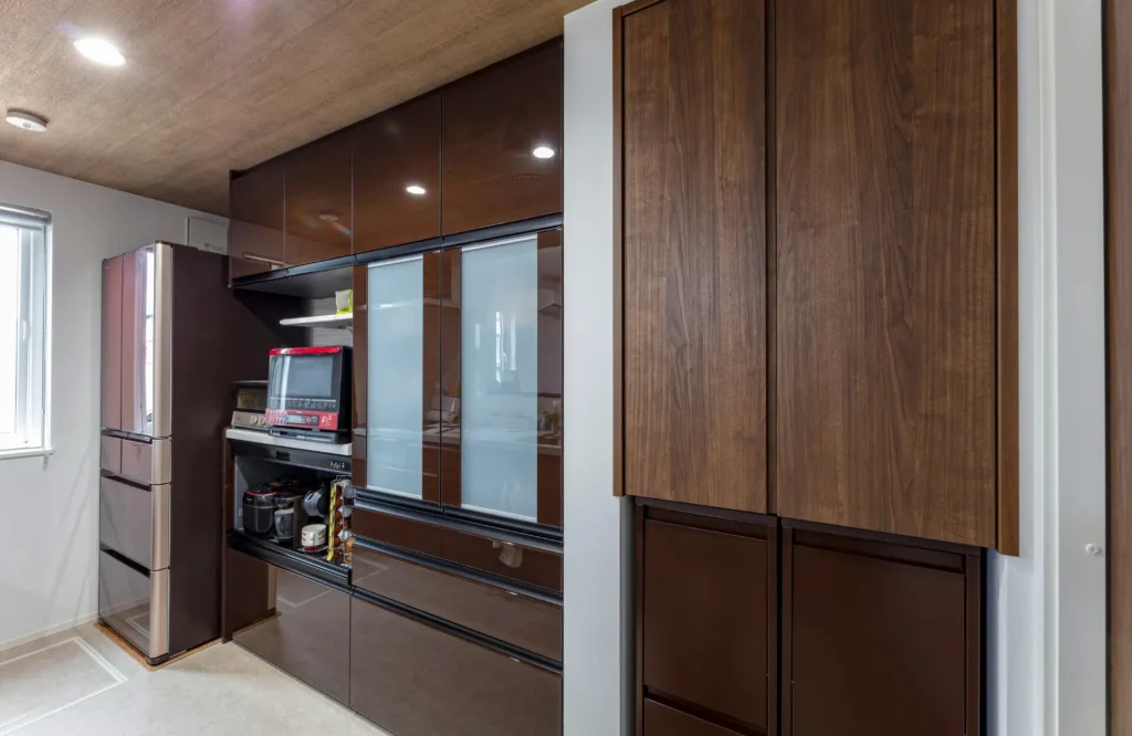 キッチンと同じダークブラウンを選んだカップボード。