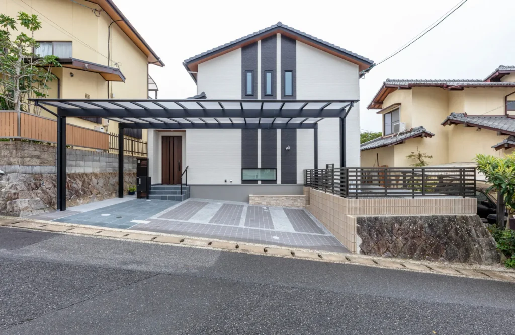 玄関前にはタイルでアプローチラインを演出し、住み替えの条件となった並列3台駐車可能のガレージには大きな屋根をかけました。
