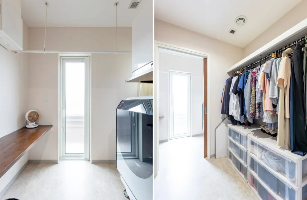 ランドリールームには、勝手口、洗濯機、乾燥機、室内干しポール、家事カウンターを設置し、衣類は隣のファミリークロークにまとめて収納できるようにしました。