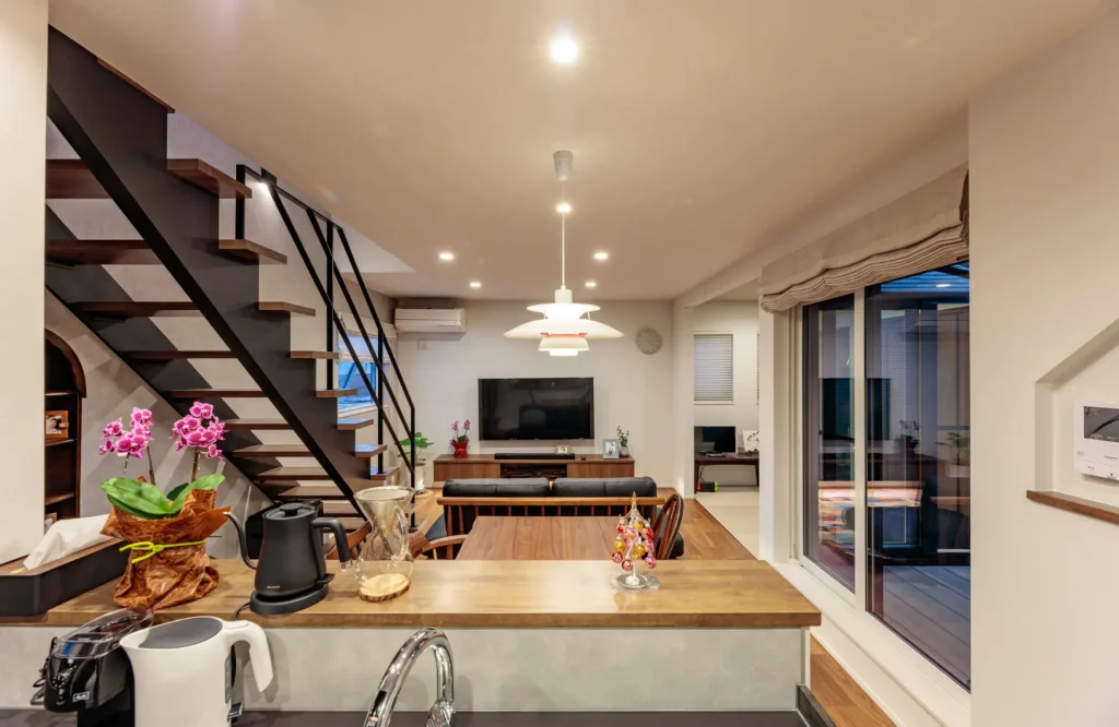 写真右手の中庭バルコニーと和室が横の広がりを、左手のリビング階段から3階が縦の広がりを感じさせるレイアウトに。