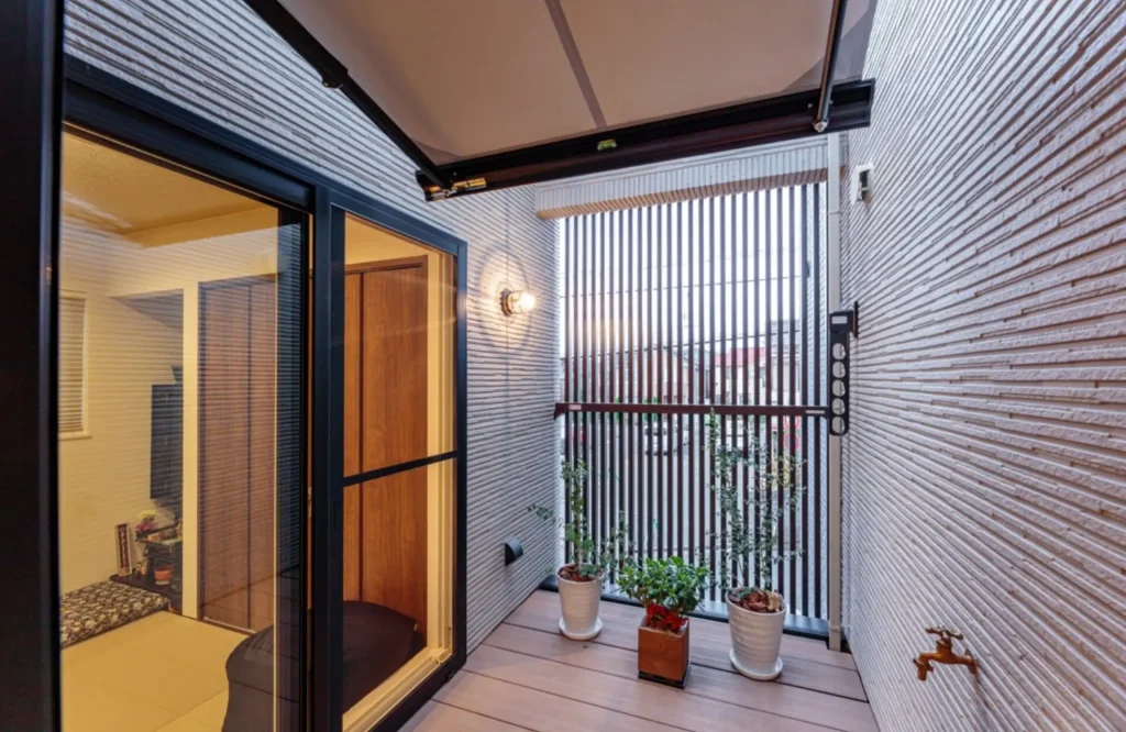 上部には西日を避けるオーニング、壁には観葉植物用の水栓を設置。