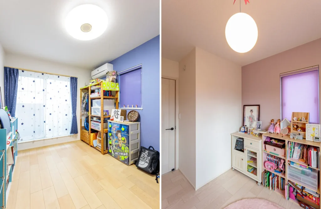 3階に設けた子ども部屋は、ご兄妹それぞれが好きな色のアクセントクロスを選んでコーディネートしました。